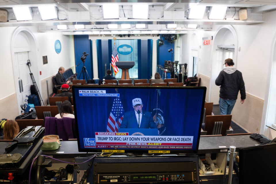 A monitor plays footage of President Donald Trump announcing US and Israeli strikes against Iran in the James Brady Press Briefing Room of the White House in Washington, DC, on February 28, 2026. | Aaron Schwartz/Bloomberg via Getty Images